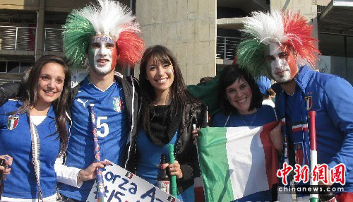 6月24日下午,意大利队将在约堡爱丽丝公园球场迎战斯洛伐克队。赛前,两国的球迷在场外备战。图为意大利帅哥美女在准备“迎战”稍后的赛事。中新社发 沈晨 摄