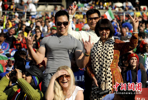 6月24日,一个来自中国江苏的家庭在约翰内斯堡埃利斯公园球场看台上,他们长期居住在南非。当日,南非世界杯意大利对斯洛伐克的比赛将在这里举行。中新社发 廖攀 摄