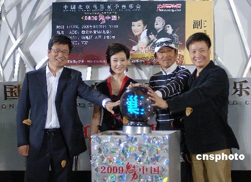 5月18日傍晚,将于6月30日上演的2009魅力中国北京鸟巢夏季音乐会,在北京召开第二次新闻发布会暨开票仪式,宣布音乐会正式进入倒计时。陈道明、阎维文、白岩松三位“好男人”作为宋祖英的好友现场助阵。据透露,这场音乐会将是鸟巢第一次使用单面立体舞台,将配置最顶尖的灯光音响设备,而宋祖英在音乐会上不仅要以充满视觉冲击的六套华服实现形象大突破,更有望与周杰伦或者多明戈激情共舞。中新社发 李学仕 摄