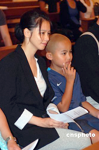 图为开拍前该片导演李前宽(左三)、肖桂云夫妇(左四),及冼星海母子扮演者徐若瑄(左一)和苏嘉航(左二)等参加教堂为剧组安排的祈祷仪式。