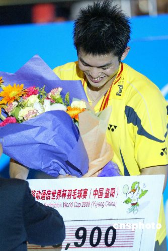 10月28日,2006世界杯羽毛球赛男单决赛在湖南益阳举行。2005世界杯男单冠军林丹在击败队友陈郁后成功卫冕。图为林丹在领奖台上。中新社发 李思之 摄