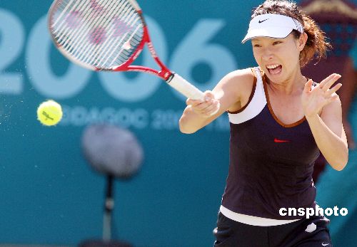 多哈当地时间十二月十三日中午,中国选手郑洁以二比一击败印度的米尔札,夺得多哈亚运会女子网球单打冠军,为中国队获得本届亚运会上的首枚网球金牌。中新社发 毛建军 摄