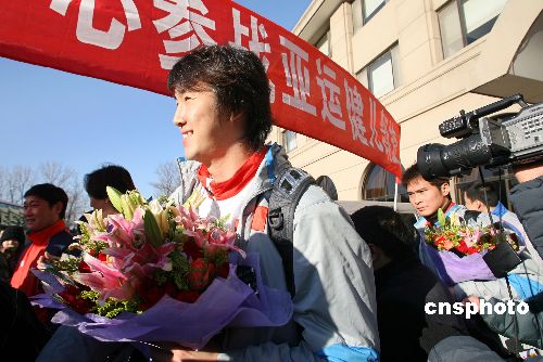 十二月十七日,中国亚运代表团载誉归来抵达北京首都国际机场。在第十五届亚运会上,中国代表团获得一百六十五枚金牌、八十八枚银牌和六十三枚铜牌,金牌总数和奖牌总数都居首位。中新社发 廖攀 摄