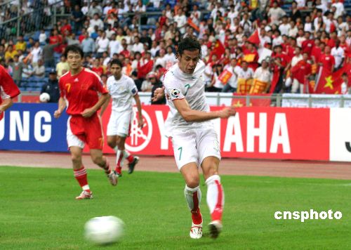 七月十五日晚,亚洲杯足球赛迄今最精彩的一场比赛由中国与伊朗共同演出,最终双方2比2握手言和。图为比分落后的伊朗队奋起反击,上半场眼看就要结束时七号赞迪起左脚劲射得分。中新社发 苏祥新 摄