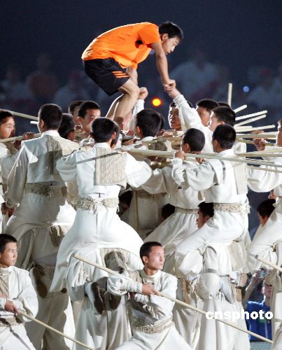 10月2日晚,2007年世界夏季特殊奥林匹克运动会在上海开幕,以“和谐,人类的共同梦想”为主题的开幕式体现了“一切以智障人士为本”的核心理念,特奥运动员成为了开幕式上当仁不让的主角。图为中国特奥选手吴方淼爬上由演员们组成的“长城”。中新社发 汤彦俊 摄