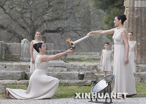3月24日,北京奥运会圣火取火仪式在希腊奥林匹亚举行。图为扮演最高女祭司的玛利亚·娜芙普利都(前右)点燃火种罐。 新华社记者戚恒摄
