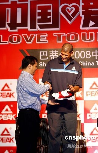 八月二十八日,美国NBA火箭队球星肖恩.巴蒂尔出席第三代战靴新闻发布会。巴蒂尔向中国篮球博物馆负责人(左)赠送展品。中新社发 王丽南 摄