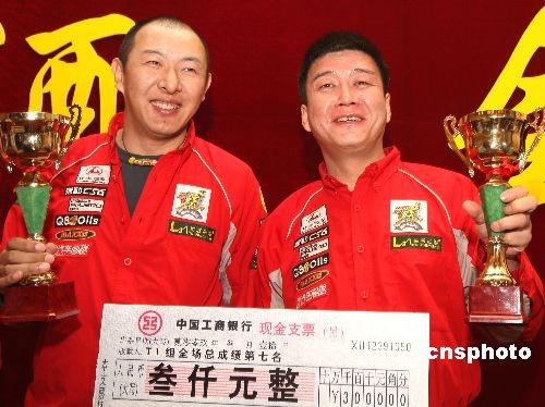3月10日,经过三天的激烈角逐,“金马杯”第六届漠河冰雪汽车越野赛暨全国汽车越野系列赛,在黑龙江省漠河县境内中俄界江黑龙江摄氏零下20多度的自然冰雪江面上结束,长丰汽车华南虎车队刘斌(右)在三天的比赛中两次夺得“飞车王”奖,最终获得全场“飞车王”奖。中新社发 赵振清 摄