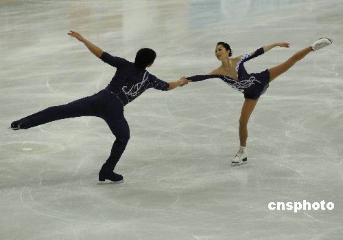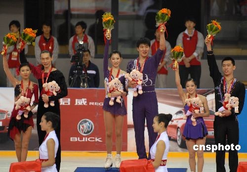 4月10日,第十一届全国运动会“中国移动通信杯”花样滑冰在山东青岛国信体育馆继续进行。在当晚的双人滑决赛中,黑龙江省代表队选手张丹/张昊以206.54分的总成绩夺得金牌,队友庞清/佟健以197.67分的总成绩夺得银牌,四川省代表队选手董慧博/仵一鸣以155.24分的总成绩获得铜牌。中新社发 楚天行 摄