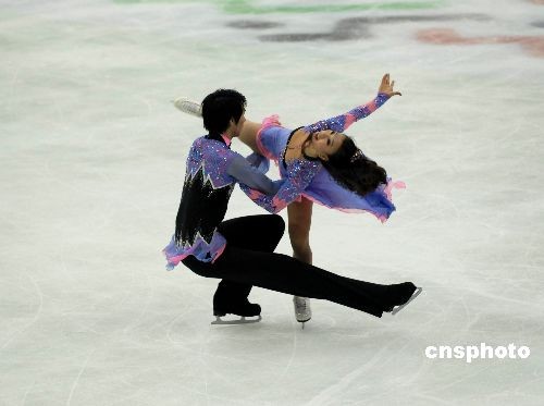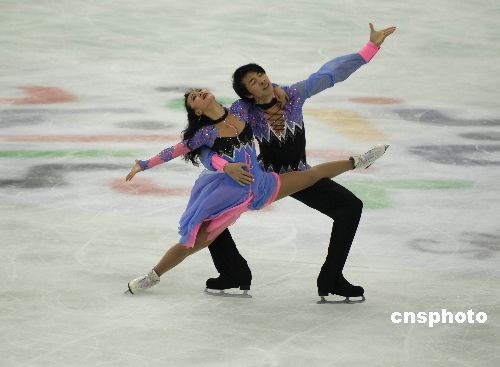 2009年4月11日,第十一届全国运动会“中国移动通信杯”花样滑冰赛在山东青岛市国信体育馆继续进行。在当日下午的冰舞决赛中,黑龙江省代表队选手黄欣彤、郑汛以151.45分获得金牌。中新社发 楚天行 摄