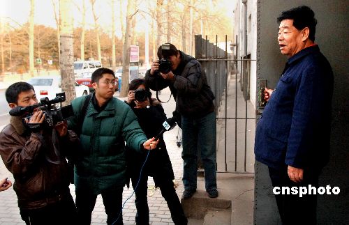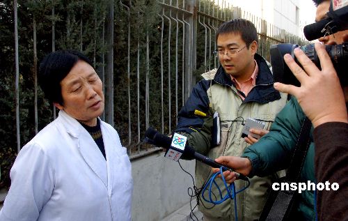 十二月二十日,北京中日友好医院,记者们争相采访负责马季遗体处理的工作人员。当日上午十时二十五分,中国著名相声表演艺术家马季因心脏病突发,抢救无效,病逝于北京家中。随后,救护车将其送往中日友好医院。中新社发 廖攀 摄