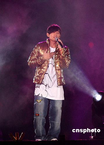 四月二十一日,中国台湾当红艺人周杰伦、罗志祥、黄立行、潘玮柏与南拳妈妈组合,在重庆奥林匹克体育中心举行“超级巨星演唱会”。图为周杰伦在演唱会上深情演唱。中新社发 李慧 摄