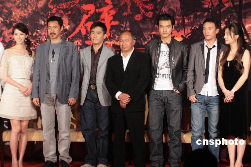 五月十日,由吴宇森执导、投资八千万美元的华语电影《赤壁》在北京举行了全球首次新闻发布会,在发布会上,导演吴宇森携梁朝伟、金城武、张丰毅、张震、林志玲、赵薇、胡军、尤勇、侯勇、佟大为、小宋佳以及剧组主创人员集体亮相。中新社发 盛佳鹏 摄