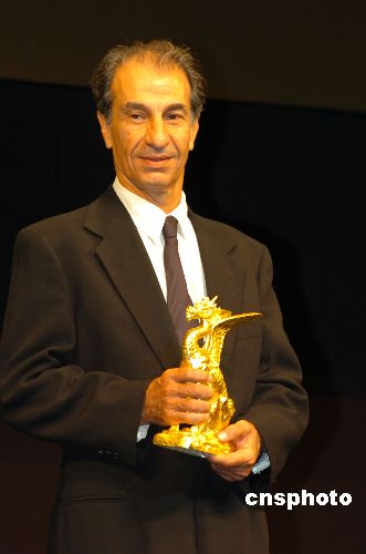 10月28日下午,第20届东京国际电影节在东京涩谷文化村举行颁奖典礼,以色列电影《乐队来访》获得了最高奖项金麒麟大奖。图为该片导演Eran Kolirin获奖后手捧金麒麟奖杯发表感言。中新社发 滕剑峰 摄