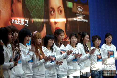 十一月二十一日,王家卫联合女性交友网站爱情公寓在北京长城脚下公社举办新闻发布会,通过爱情公寓征选的十位蓝莓女孩集体亮相,他们还将搭乘蓝莓巴士进行为期一个月,走遍全国十个城市的旅程,女孩将会在爱情公寓网站中上传每日旅行日记照片,最终由网友票选一位最具有蓝莓精神的蓝莓天使。片方希望通过这种形式宣传,让电影里的情节在生活中同样可以实现,并让这十位蓝莓女孩也有机会体会诺拉琼斯在电影里的感情旅程。中新社发 廖攀 摄