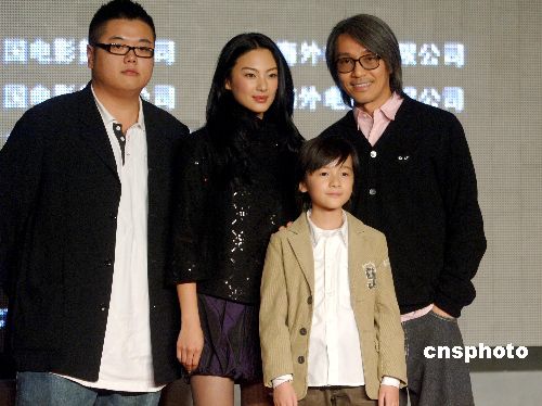 十一月二十二日,周星驰携张雨绮(左二)、徐娇(右二)、林子聪(左一)在北京出席其新片《长江七号》的发布会,他接受记者采访时坦言这部电影是源自自己从小的一个梦想,并曾真的见过两次UFO。中新社发 廖攀 摄