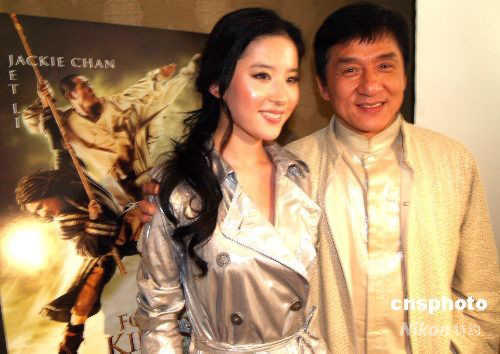 4月11日,美国好莱坞举行由好莱坞功夫明星成龙、李连杰主演的新片《功夫之王》首眏式。图为成龙与中国影坛女星刘亦菲出席首眏式。中新社发 卢威 摄