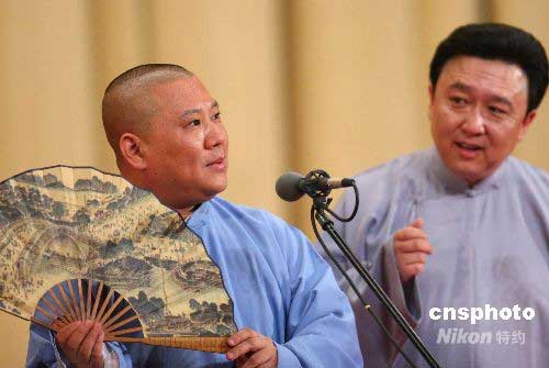 5月3日,纪念著名相声大师侯宝林先生诞辰九十周年暨德云社相声精品晚会,在北京人民大会堂举行,当红相声演员郭德纲率领德云社成员侯震、于谦、何云伟、曹云金、李菁等为观众献上了一场精彩的演出。全场所有段落都是在侯宝林先生原作的基础上稍加修改而成,这其中包括了《卖布头》、《戏曲与方言》、《歪批三国》等经典段子。中新社发 富田 摄