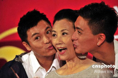 九月二日,香港艺人汪明荃出席记者会时,受到郭晋安(左)及黄宗泽的亲面,祝贺她六十一岁生日快乐。中新社发 谭达明 摄