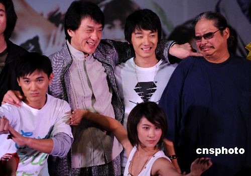 十月十八日,香港影星成龙、洪金宝在北京向人们力荐主演电影《武术之少年行》的三位武术新锐。洪金宝担纲主演该片,成龙出任该片监制。而该片主演刘峰超(前排右一)是全国剑术冠军,王文杰(前排左一)也是一名新锐武打演员。该片影片将于十月二十四日在全国上映。中新社发 廖攀 摄