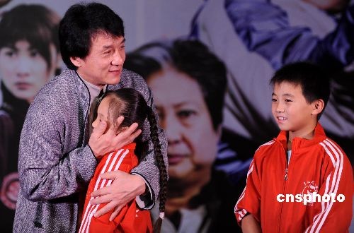 十月十八日,香港影星成龙爱抚电影《武术之少年行》中的小演员。当日,该片在北京召开新闻发布会,洪金宝担纲主演该片,成龙出任监制。而该片主演刘峰超是全国剑术冠军,王文杰也是一名新锐武打演员。该片影片将于十月二十四日在全国上映。中新社发 廖攀 摄