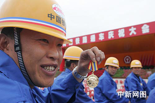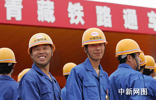 七月一日上午,青藏铁路通车庆典在青海格尔木火车站南广场举行。图为青藏铁路建设者代表参加通车庆典。中新社记者 武仲林 摄
