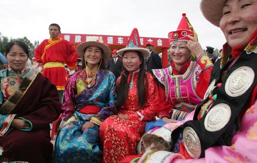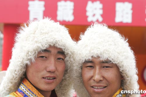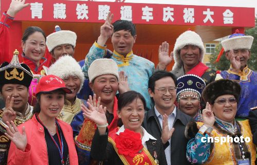 七月一日上午,青藏铁路通车庆典在青海格尔木火车站南广场举行。图为参加通车庆典的少数民族同胞。中新社记者 武仲林 摄