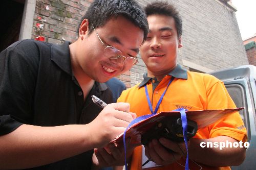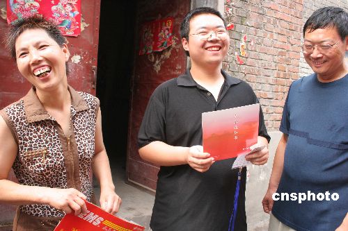 7月8日,郑州市管城回族区民乐中里路宋润博收到郑州大学体育学院录取通知书,据悉,这是河南第一份高考录取通知书送达考生手中。当日,河南省首批高考录取通知书正式开始投递,首批是郑州大学体育学院的724份录取通知书已开始陆续向全国各地发放。中新社发 陈代述 摄
