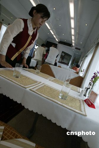 七月份,青藏铁路开通,北京至西藏拉萨成为今年夏天人们的旅游热点。设备精良的列车为旅客提供了良好的条件和服务,在洁净的餐车上旅客可以品尝到家常、川、藏等不同口味的菜肴。中新社发 任海霞 摄