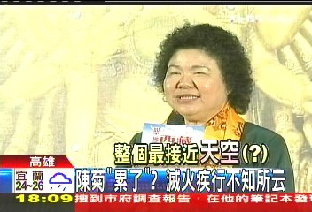 报道称,尽管被批得满头包,陈菊还是照跑行程,29日下午和高雄县长杨秋兴同台时,不但显露疲态,还有点语无伦次。道歉、勘灾、还得跑行程,陈菊只能用焦头烂额来形容。