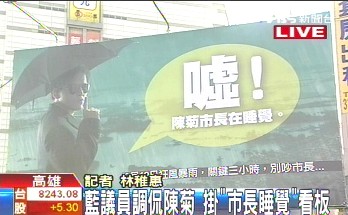 中新网10月1日电 据台湾TVBS报道,高雄市长陈菊坦承在919风灾当天下午,人在官邸休息,风波持续延烧,蓝营议员昨天(9月30日)下午在高雄市中心,挂上调侃陈菊市长的广告牌,内容是一名黑衣人回头比“嘘,市长在睡觉”,极尽调侃之能事。