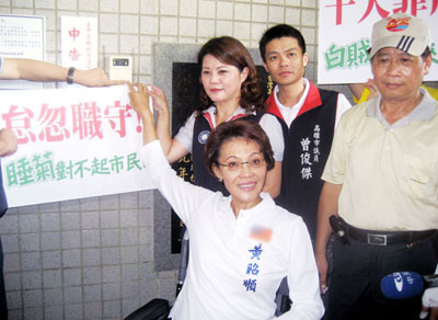 台风“凡亚比”造成高雄淹大水,中国国民党高雄市长参选人黄昭顺(前)不满高雄市长陈菊于风灾时回官邸休息,造成灾民损失,13日到高雄地检署按铃申告陈菊怠忽职守;陈菊回应说,市府已主动将风灾资料交给检调单位调查,希望透过司法厘清责任,市府绝不包庇。来源:“中央社”