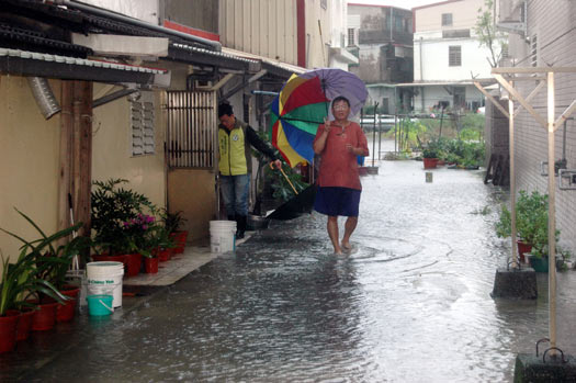 宜兰县 21日降下豪雨,罗东镇万长春圳附近有7户民宅后方的厨房与道路淹水,影响进出。