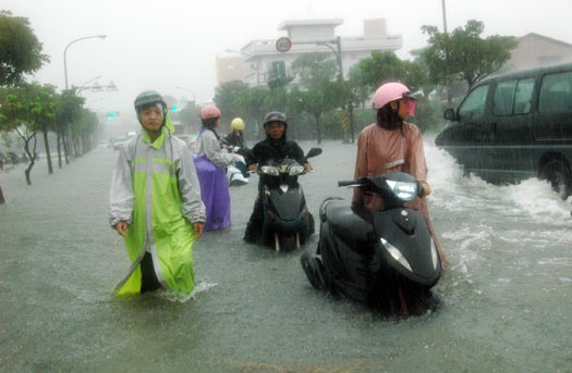 宜兰县21日降下豪雨,罗东镇中山路 2段道路淹水,许多骑士牵着抛锚的机车,强行涉水返家。