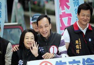 中新网11月25日电 据台湾“今日新闻网”报道,台北县长周锡玮24日与国民党新北市长候选人朱立伦夫妇进行车队扫街拜票,全力冲刺争取选民投票支持。