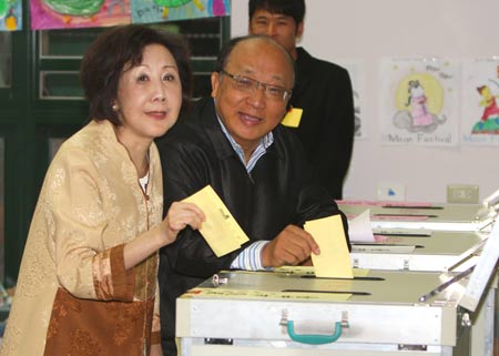 胡志强邵晓铃夫妇在投票 “中央社”图