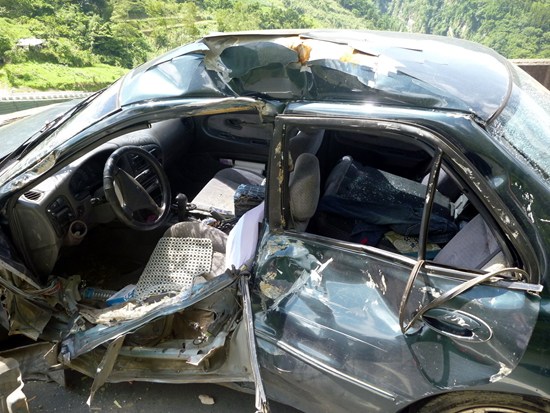台湾南投县2日发生里氏6.7级地震(台湾岛内气象部门测定为6.3级),嘉义县阿里山震度5级,瑞水公路一部自小客车遭落石砸中,车体扭曲变形,女驾驶陷入昏迷送医。(图片来源:台湾“中央社”)