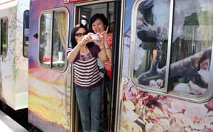 阿里山森林铁道移交之后,今天首班上山观光彩绘列车,在贵宾拉下彩球正式启动出发,搭上第一班列车的乘客都兴奋不已。