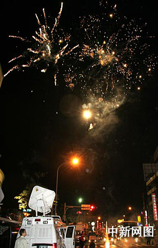 支持国民党的民众在中国国民党中央党部大楼外施放烟火,庆祝“立委”选举大胜。 作 者:孙自法