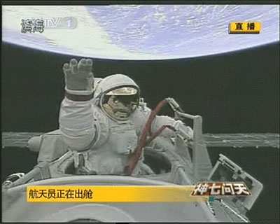 台湾东森新闻报道说,神舟七号航天员翟志刚于下午顺利在太空中迈出第一步。穿着中国研发制造总重120公斤,造价3000万人民币宇宙飞行服的他,以头先脚后的方式进入太空,白色宇宙飞行服上鲜艳的五星红旗显得格外醒目。