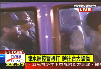法院在晚间十时五十分左右派车载陈水扁前往台大医院,在层层警力戒护下接受验伤。陈水扁抵达台大医院时,没有答复媒体任何提问。