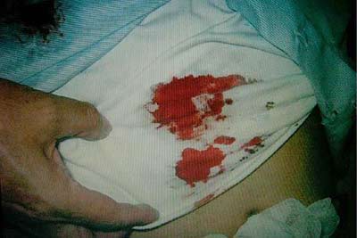陈水扁露出刚进入医院治疗时的斑斑血迹供院方拍照。