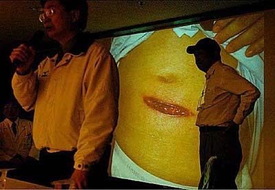 “总统府”发言人黄志芳(左)及奇美医院院长詹启贤(右)在记者会中向民众说明病情。