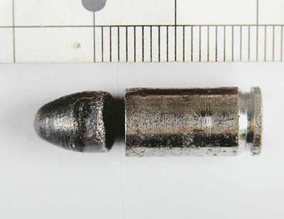 台北市刑事警察局召开记者会,澄清陈水扁遭枪击所用的枪支并非媒体所报导的掌心雷,图为枪伤陈水扁铅质弹头的子弹,是在陈水扁的夹克发现。