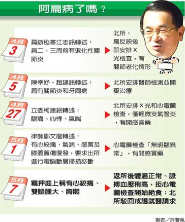 一名不愿具名的精神科医师则判断,阿扁出现的各种症状可归为“心身症”,主要在于他刚从总统卸任不久就被收押,心理无法调适,加上全家面临官司;而且他在所内独居一室,都造成他情绪煎熬,无法纾解。他劝扁此刻应“身体放松,脑袋放空”,才是面对未来之策。