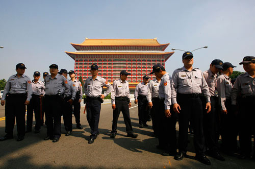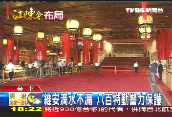 据台湾TVBS报道,这回光是警力,“警政署”就动员七千人次负责安全。从饭店牌楼,一直到大厅,都有便衣刑警站岗,同时后方的停车场,还有支持保警24小时待命。