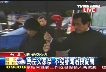中新网2月3日电 国民党2008参选人马英九的岳父日前去世。今天(3日)举办公祭,马英九家人一大早就出门前往殡仪馆。家祭的最后,马英九跪在老丈人遗体面前,感性地表示自从和周美青结婚后,让周美青相当委屈,也感谢老丈人多年来在背后的支持。