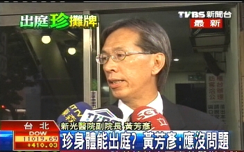 据台湾TVBS报道,黄芳彦说:“法院的准备都很好,我想都有万全的准备,因为我不是她的主治医师,所以病情我也不了解,也不便多透露,我是她的家庭医生,而她的病需要专科医生来照顾,我想法院也会以主治医师的意见为意见。”