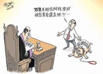 上星期叶盛茂隐匿公文案开庭,陈水扁出庭作证,两人法庭的互动,又给季青画“忠狗”的灵感。“叶盛茂对陈水扁卑躬屈膝,陈水扁却对他不假辞色,还说宁愿相信吴淑珍也不相信‘调查局’,第二张忠狗画面就浮现在脑海!”