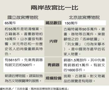 而针对郑欣淼比较北京故宫与台北故宫典藏数量及重要性的见解,台北故宫博物院副院长冯明珠坦承,论数量的确是北京故宫较多,重要与否则“见仁见智”。对研究清史的学者来说,北京故宫是比较重要,但研究宋代艺术史的学者,一定选台北故宫,若就文物的精致度、重要性和艺术性做比较,那应该请艺术史学者来发表看法较客观。